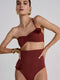 El enterizo Bettin presenta un escote barco que se complementa con mangas largas ajustadas, ofreciendo un toque sofisticado que resalta las líneas naturales del cuerpo y se ve contrastado por un escote profundo asimétrico en la parte posterior, adornado con un panel drapeado que cae de forma fluida en diagonal sobre la parte baja de la espalda.